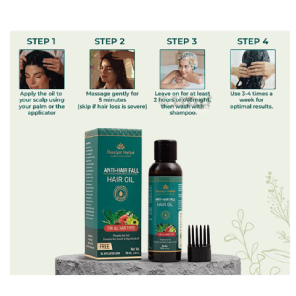 Apply the oil to your scalp using your palm or the comb applicator. Gently massage for 5 minutes (if comfortable). Leave on for at least 2 hours or overnight, then rinse with shampoo. Use 3-4 times a week for best results.