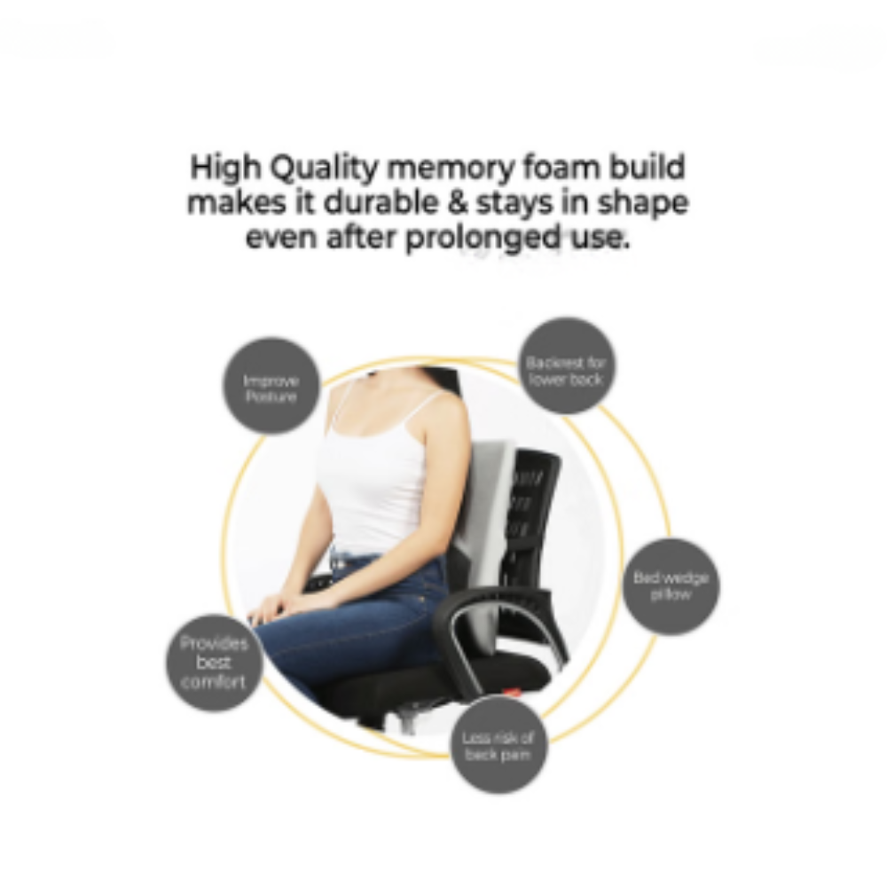 Back Rest High Ergonomic Lumbar Support Cushion Black & Grey: Back Rest High Ergonomic Lumbar Support Cushion is designed to provide optimal support and comfort for your lower back during prolonged sitting. Engineered with high-quality memory foam, this cushion helps maintain its shape and provides consistent support. Whether used in the office, car, home, or wheelchair, it enhances posture and reduces the risk of back pain, making it an essential accessory for daily use. Uses: It is used to provide ergonomic support to the lower back, improving posture and reducing discomfort during prolonged sitting Key Benefits: