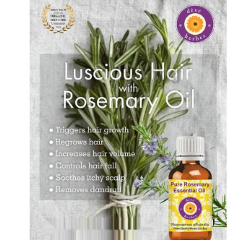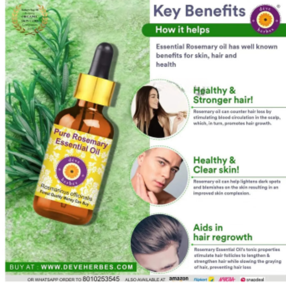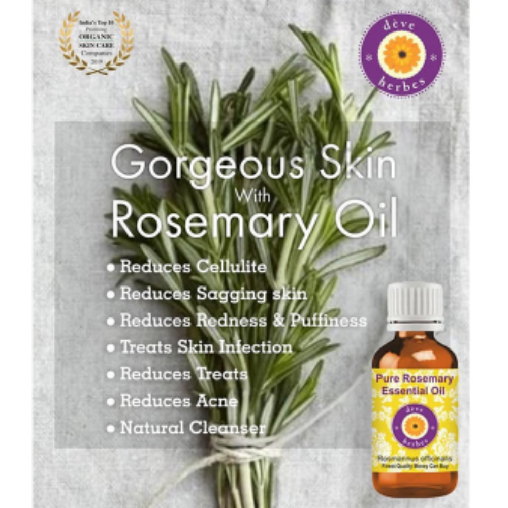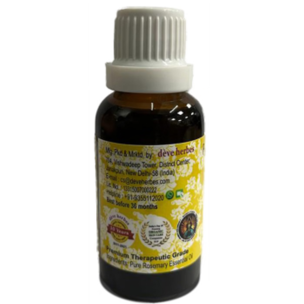 Deve Herbes Pure Rosemary Essential Oil has many health benefits because of the high antioxidant activity of its main chemical constituents, including carnosol, carnosic acid, ursolic acid, rosmarinic acid, and caffeic acid. It has a fresh, herbaceous, sweet, and slightly medicinal aroma that can help energise the body.