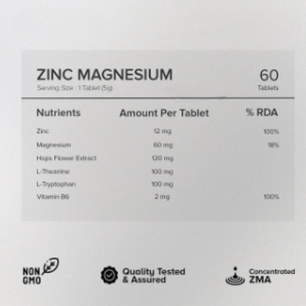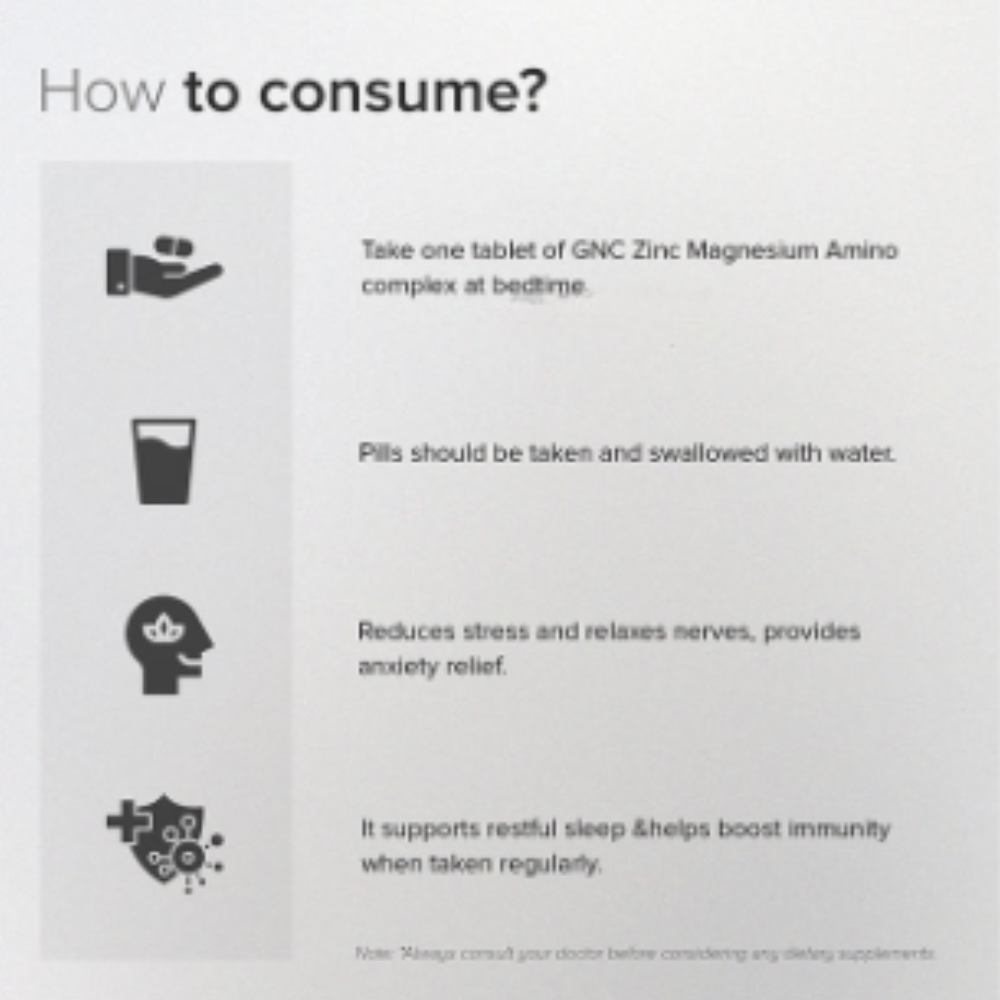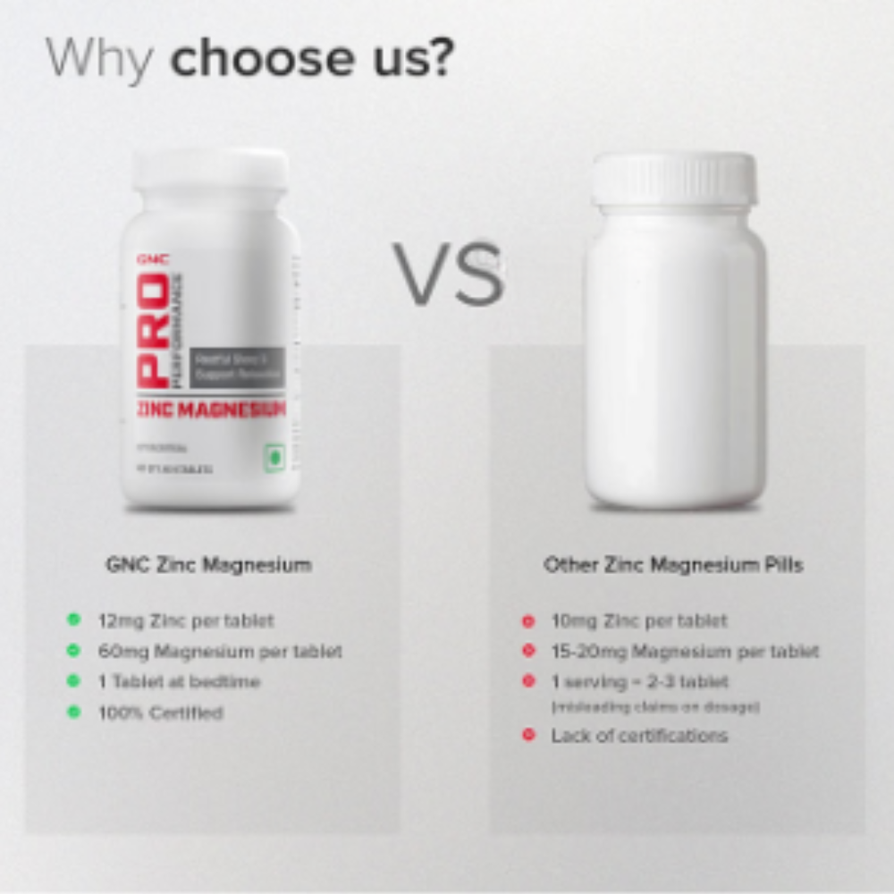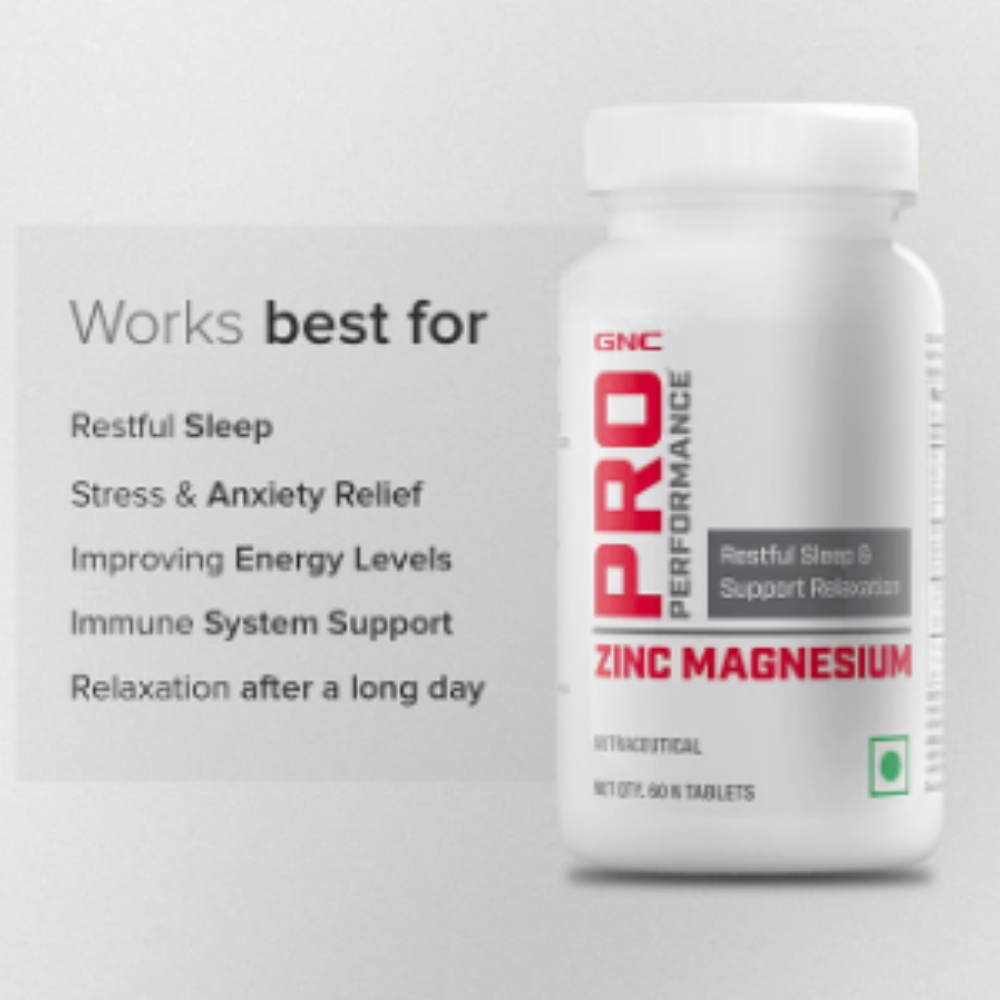 GNC Pro Performance Zinc Magnesium Tablet is a dietary supplement containing zinc, magnesium, vitamin B6, amino acids, and hops flower extract designed to support overall wellness.