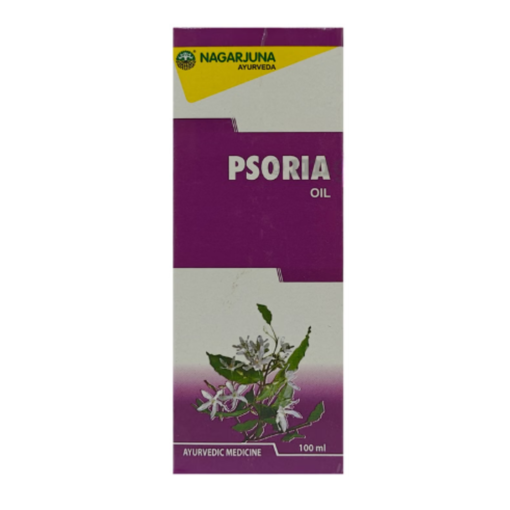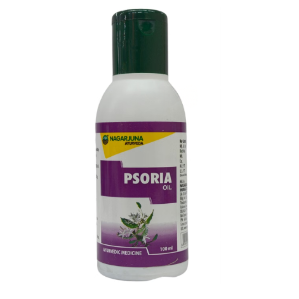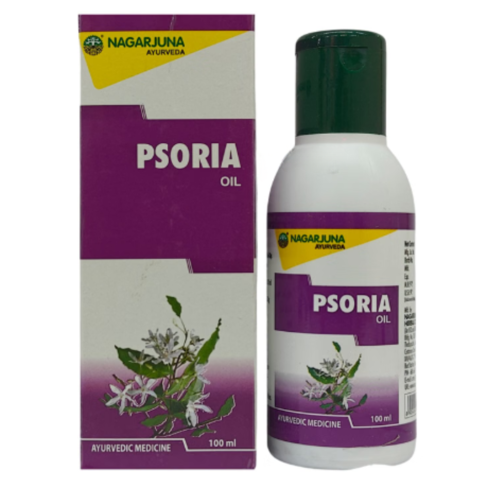 Nagarjuna Psoria Oil contains stri kutaja (wrightia tinctoria leaves) and coconut oil as a combination of ingredients. It is indicated for psoriasis. It is also useful for dandruff, scaling, and fungal skin infections.