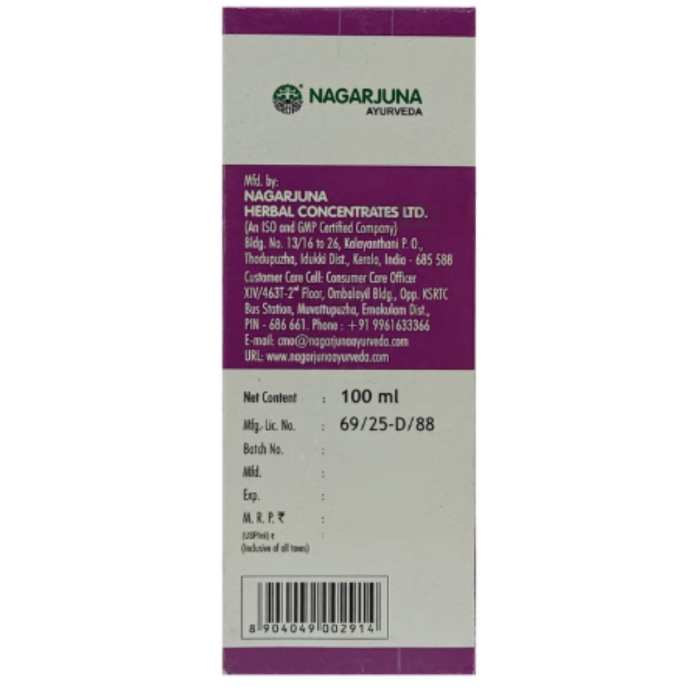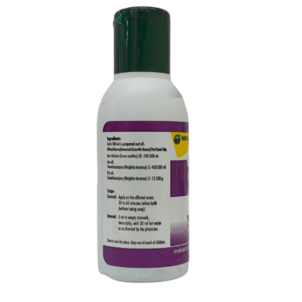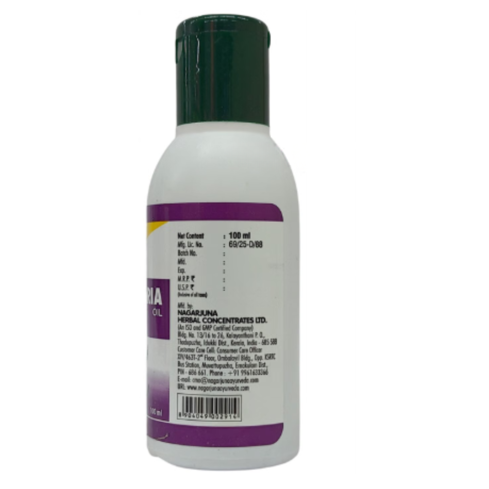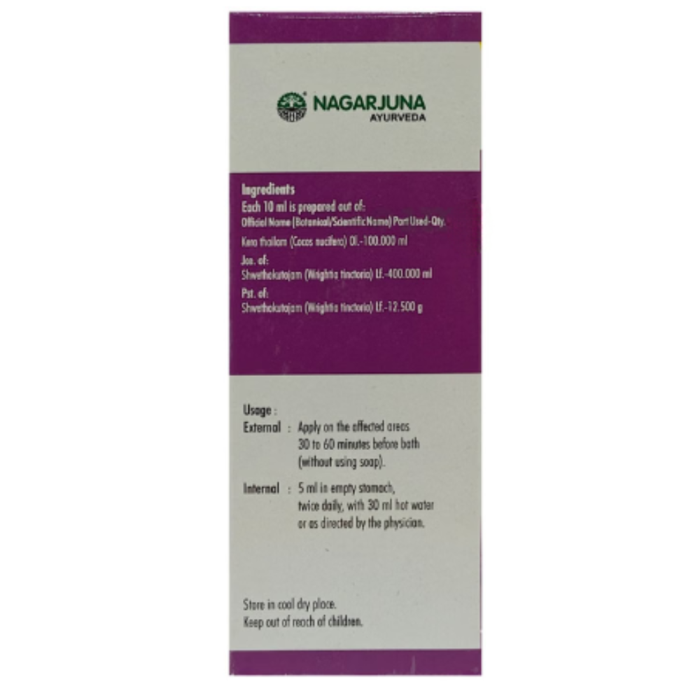 Nagarjuna Psoria Oil contains stri kutaja (wrightia tinctoria leaves) and coconut oil as a combination of ingredients. It is indicated for psoriasis. It is also useful for dandruff, scaling, and fungal skin infections.
