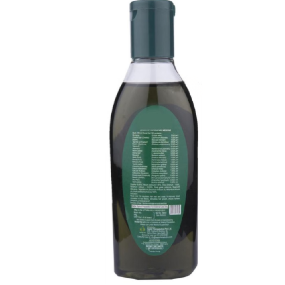 Bhringaraj(Ecliptaalba), Chameli pan (Chitika)(Jasminumofficnale), Brahmi (Bacopamonnieri), Tee tree Oil(Kajuput), Melaleucaalternifolia, Elaychi (Sukshma) (Elettaria cardamom), Vitamin E, Jatamanshi (Jatamansi), Neem (Seed) (AzadirachtaIndica), Henna leaf( Lawsonia alba), Rasvanti(Berberisaristala), Alma (Fruit)(Emblicaofficinalis), Harad (Fruit)(Terminaliachebula), Beheda (Fruit)(Terminaliabelerica), Yashtimadhu(Glycerrhizaglabra), Chanothi (Krishnala)(Abrusprecatorius), Dhatura (Mahamohi)(Dhaturametel), Gali pan (Kalkasi) (Indigoferatinctoria), Indravama (Gavakshi)(Citrulluscolocynthis), Karanj seed (Chirbilvak)(Pongamiaglabra), Mandur (Sinhan) (Ferriperoxidumrubrum), Akkar Kara (Anacycluscalamus), Vach (Jatila)(Accruscalamus), Dugdha, Triticum aestivum, Citrus Limonum, and Sesamumindicum