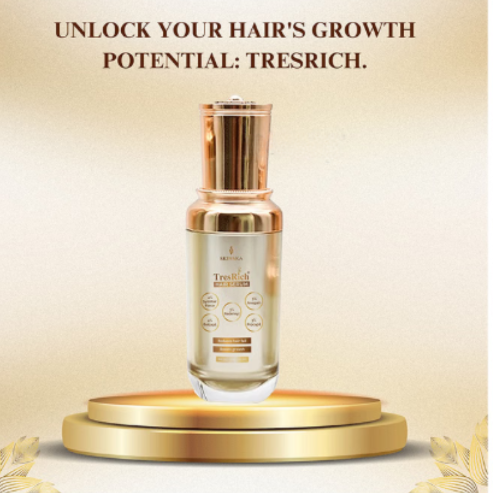 TresRich Hair Serum is an effective hair care product which helps to strengthen the hair follicles, prevents hair fall and restores hair growth. It helps to revitalise the hair and maintains hair volume. This hair growth serum is chemical-free and free of parabens, essential oils, and all other sorts of fragrances. It is suitable for all hair types.