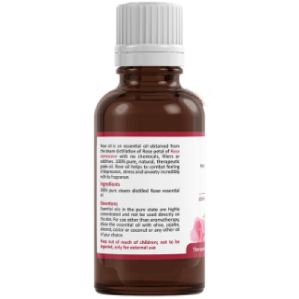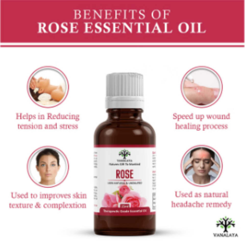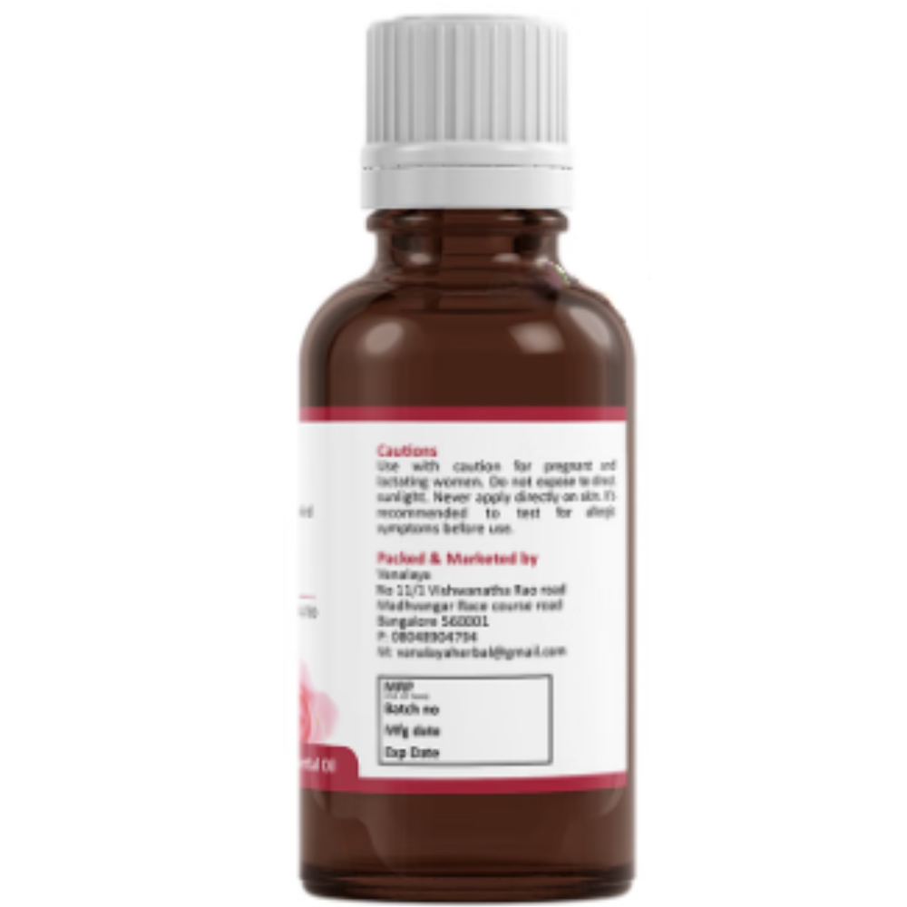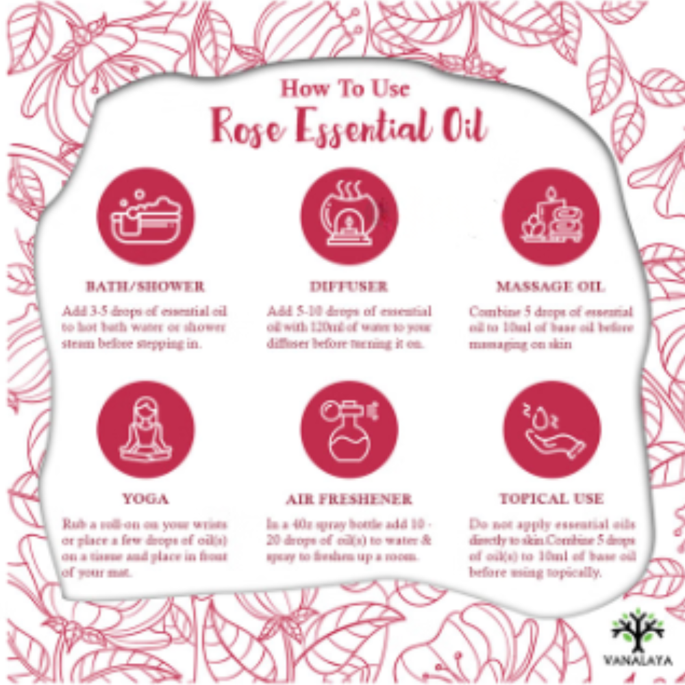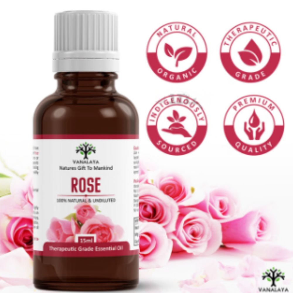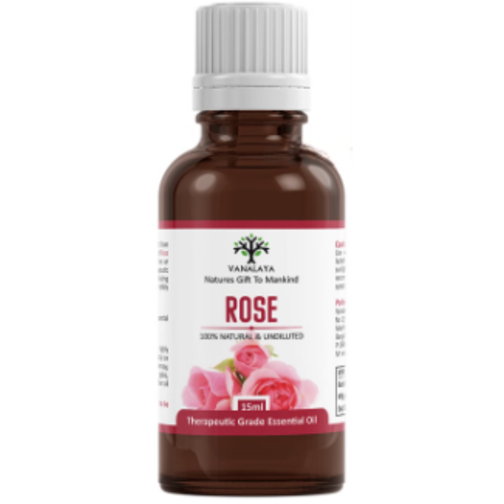 Vanalaya 100% Natural & Undiluted Rose Oil is made from rose petals, which imparts its sweet and floral fragrance along with physiological and psychological benefits. The aroma of the rose oil, when inhaled, releases the good hormone by stimulating the brain. Hence, rose oil finds many potential uses in aromatherapy. The benefits of rose essential oil promote holistic well-being amongst people. Rose essential oil is used in a diffuser for a soothing rose fragrance to create a romantic mood and environment. Rose essential oil is in demand at spas and five-star hotels. The oil is obtained through solvent extraction from the flowers of the rose plant. It has a very strongly sweet floral aroma. Besides, it has been used to revive natural beauty for thousands of years.