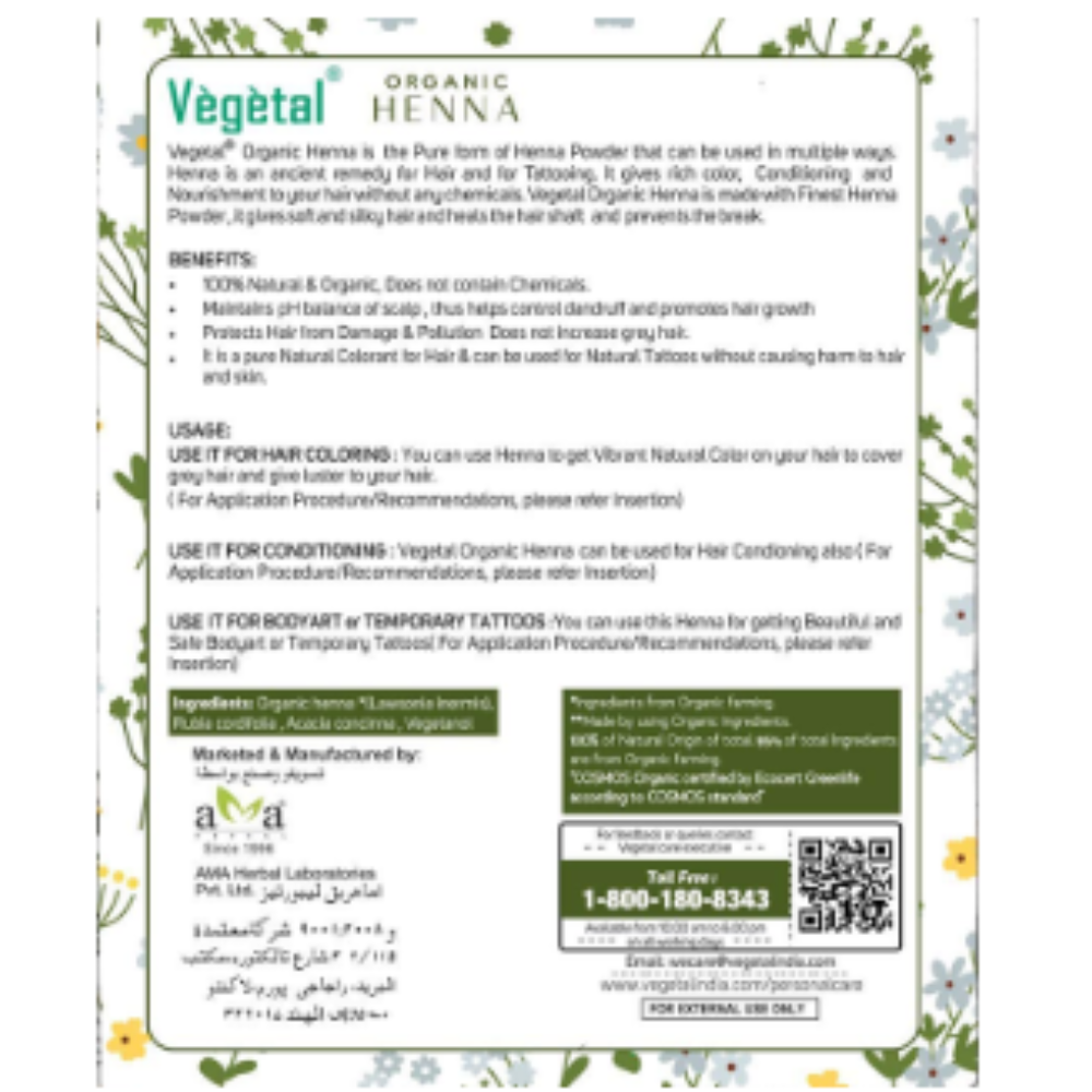 Vegetal Organic Henna is the pure form of henna powder that can be used in multiple ways. Henna is an ancient remedy for hair and tattooing. Vegetal organic henna is made with the finest henna powder and gives rich colour, conditioning and nourishment to your hair without any chemicals. It helps fight off scalp conditions like dandruff and hair loss. It also promotes hair growth.